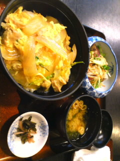 軍鶏の親子丼とカツオのたたきのサラダとお味噌汁、お漬物。