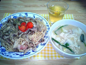 茹でたスパゲティを入れて最後にしょうゆをざっとかけて